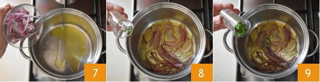 In a large pot, pour the oil and the sliced onions 7, sauté for 2 minutes then flavor with the rosemary 8 and the parsley 9,