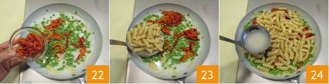 At this point, put the pan with the peas back on the stove, add the bell pepper strips 22 and cook them over low heat for about ten minutes. When the pasta is al dente, drain it directly into the pan with the peas and peppers 23, season with pepper and sauté briefly to mix it with the sauce, adding a ladle of cooking water if necessary 24, then turn off the heat.