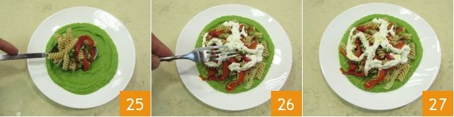 Distribute the velvety pea pod cream on serving plates, add the pasta seasoned with peppers and peas 25 and complete with a few threads of burrata 26. Drizzle with a little oil and a grind of pepper, and your pasta with pea pods is ready to be served 27!