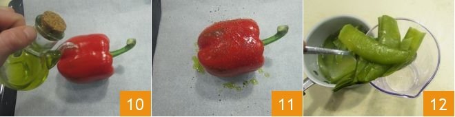 While the pods are cooking, wash and dry the whole bell pepper, then place it on a baking sheet lined with parchment paper; season it with oil 10, salt, and pepper 11 and bake in the preheated fan oven at 464°F for at least 20 minutes. Meanwhile, bring a large pot of salted water to a boil. When the pods are cooked and the water in the saucepan has reduced by at least a third, transfer them to a tall and narrow container 12.