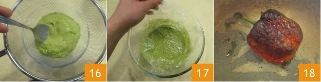 Strain the cream obtained through a fine-mesh strainer 16 to achieve a smooth and velvety consistency, then cover it with plastic wrap in contact 17 and set it aside at room temperature. When the bell pepper is cooked 18, transfer it to a cutting board and remove the stem along with the internal seeds.