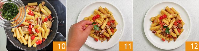 Let it season for a couple of minutes, then turn off the heat and season with chopped parsley 10. Plate, pepper, and garnish with a few parsley leaves, if desired 11. Your pasta with peppers and tuna is ready to be served 12!