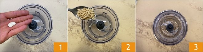 To prepare pasta with pesto and cherry tomatoes, first make the pesto: place half a clove of garlic 1 and the pine nuts 2 in the food processor, then blend everything for a few seconds 3.