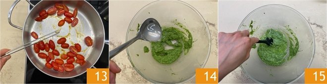 While the pasta is cooking, remove the garlic clove from the cherry tomatoes 13. Transfer the pesto to a bowl, incorporate a ladle of pasta cooking water 14, and mix well 15.