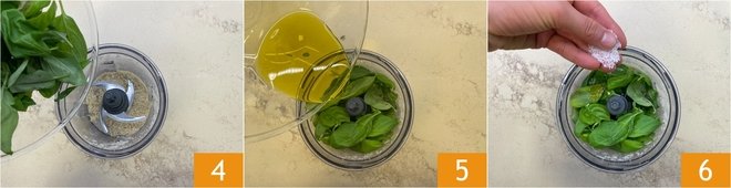 Add the basil 4, the oil 5, and a pinch of salt 6.