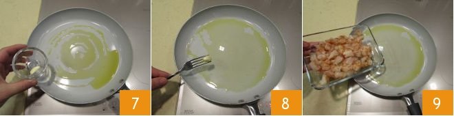 Now take a large non-stick pan, pour in the olive oil and let a whole clove of garlic brown 7 which you can easily remove once golden 8. Add the shrimp to the pan 9.