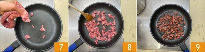 Remove the casing from the sausage, crumble it, and place it in a slightly heated skillet (without adding any fats) 7. Brown it for a few minutes, stirring often 8, until it becomes golden 9.