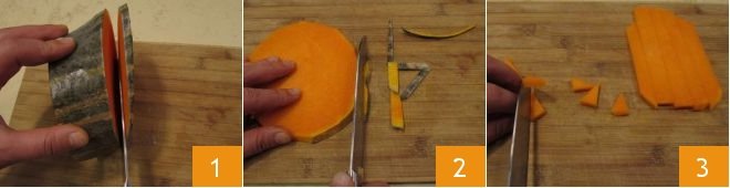 To prepare pasta with pumpkins, start by cutting the pumpkin into slices 0.4 inches thick 1, then remove the skin with a knife 2 and cut each slice into sticks 0.8 inches thick from which you will make triangles 3.