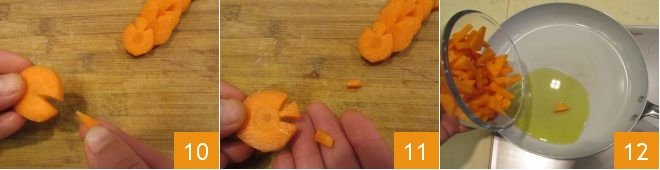 extract the triangles to get the shape of a cute pumpkin 7. Repeat the same procedure with the carrots: peel them, trim, then cut into slices 0.2 inches thick 8, carve the triangles with a knife 9
