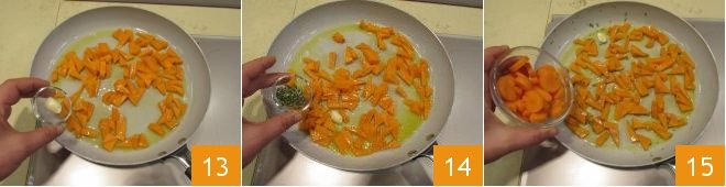 flavor with the whole garlic clove (you can omit it if you don't prefer) 13 and rosemary 14, let it sauté for 2-3 minutes, then also add the carrots 15