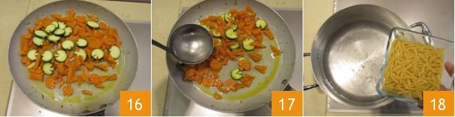 and zucchini 16, salt to taste then deglaze with a ladleful of pasta cooking water 17 and cook for about 8 minutes on low heat, at the end of cooking remove the garlic with kitchen tongs. When the water for cooking boils, pour in the mini ridged penne 18
