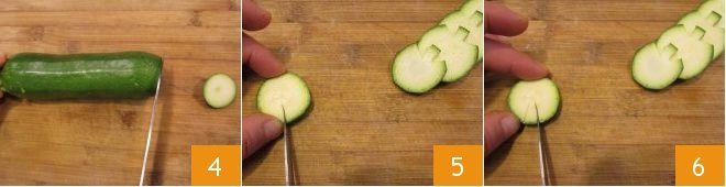 Wash and trim the zucchini, then cut them into slices 0.2 inches thick 4, take each slice and carve two spaced triangles (5-6),