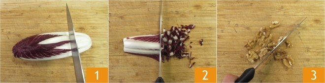 To prepare pasta with radicchio and gorgonzola, start by cutting off the hard part of the radicchio 1, then finely slice the rest and set aside 2. Coarsely chop the walnuts 3.
