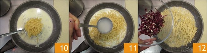 Drain the pasta into the pan with the gorgonzola cream 10 and finish cooking it for a couple of minutes, adding a little water if necessary 11. Finally, add the radicchio 12.