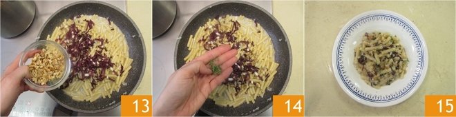Finish with the walnuts 13, pepper, and thyme 14. Plate and serve the pasta with radicchio and gorgonzola hot 15.