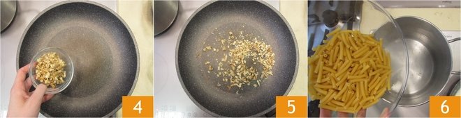 Place the walnuts in a non-stick pan 4 and toast them briefly 5, then set aside. Cook the pasta in boiling salted water 6, keeping it two minutes underdone.