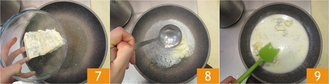 Meanwhile, put the gorgonzola in the same pan as the walnuts 7, pour a ladle of pasta cooking water 8 and stir over low heat until completely melted 9.