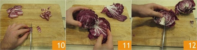Put a pot of boiling salted water on the stove: it will be used to cook the pasta. In the meantime, cut the bacon into strips about a quarter inch thick 10. Set aside and deal with the radicchio: remove the outer leaves 11, then cut it in half and remove the internal core by making two oblique cuts 12.