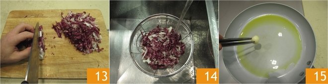 Finely chop the radicchio 13 and rinse it under running water 14, then drain well. At this point, move to the stove and let a clove of garlic infuse in 2 tbsps of olive oil 15.