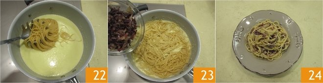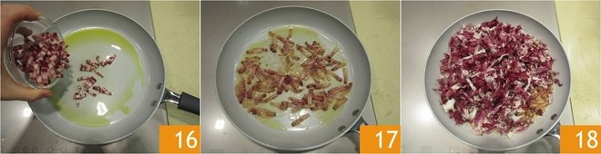 Add the bacon 16 and let it brown for 1-2 minutes on high flame, being careful not to burn it 17. Also add the radicchio 18.