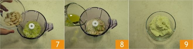 At the end of cooking, transfer the cooked leek to a mixer along with the almonds 7, then add the grated Parmigiano Reggiano DOP and 2 tbsps of olive oil 8. Blend and set the mixture aside in a bowl 9.