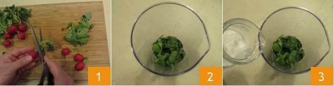 To prepare the pasta with radishes, first cut off the radish leaves that you will use to make the cream (you'll need about 1 oz of leaves) 1, rinse and dry them, and finally, place them in a blender cup 2. Then add the fresh cream 3,