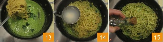 Then drain the pasta into the pesto 13 and mix, adding more water as needed to finish cooking the pasta 14. At the end of cooking, add a final drizzle of oil 15,