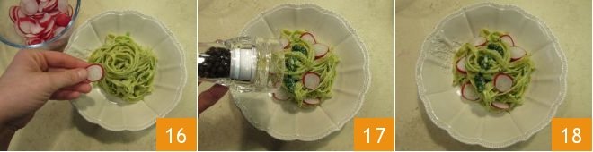 mix 16 and finally plate, garnishing with the radish slices 16 and flavoring with a pinch of black pepper 17. Here is your pasta with radishes: all that's left is to serve it piping hot 18.