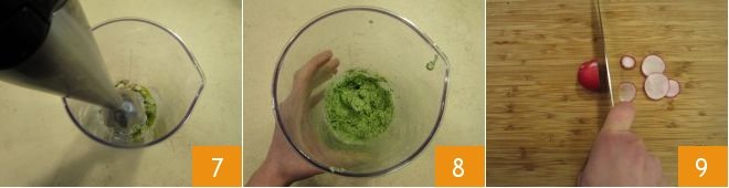 Then insert the mixer and blend everything 7. Once you have this cream, set it aside 8. Put a pot with salted water on the stove, it will be used for cooking the pasta. Also clean the radishes and slice them into thin rounds about 1/8 inch thick 9, set them aside.