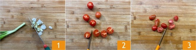 To prepare the pasta with ricotta and cherry tomatoes, first cut the scallion into slices 1. Halve both the cherry tomatoes 2 and the datterini 3.
