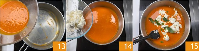 Pour the sauce obtained into the pan with the heat off 13 and add the cow's milk ricotta 14. Scent with fresh basil and give it a good stir to mix everything 15.