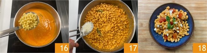 Drain the pasta al dente and transfer it directly into the sauce 16. Mix with Pecorino Romano 17, a sprinkle of pepper, and your pasta with ricotta and cherry tomatoes is ready to be served 18!