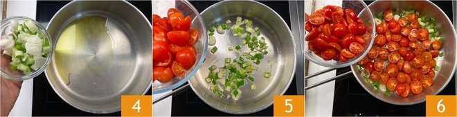 In a saucepan, pour the oil and the scallion 4 and let it stew for a couple of minutes, then add the cherry tomatoes 5 and the datterini 6.