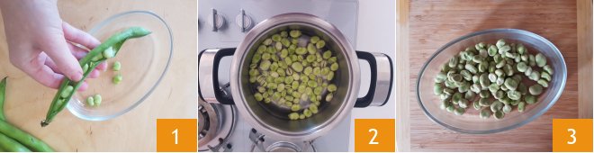To prepare the pasta with ricotta cream and fava beans, first, put a pot with plenty of salted water on the stove to cook the pasta. Shell the fava beans 1 and transfer them to a saucepan with water. Bring everything to a boil and cook for another 2 minutes 2; this way, the fava beans will soften, and it will be easier to peel them. At this point, drain them, transfer them to a container, and let them cool 3.