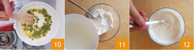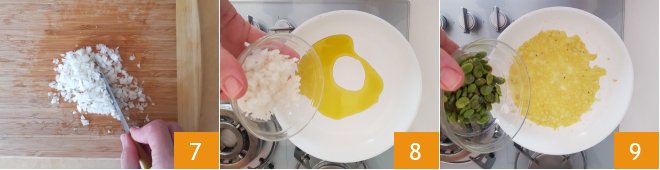 Finely chop the onion 7, heat a bit of oil in a pan, add the onion 8, season with salt, add a grind of black pepper, and lightly brown. Add the peeled fava beans 9,