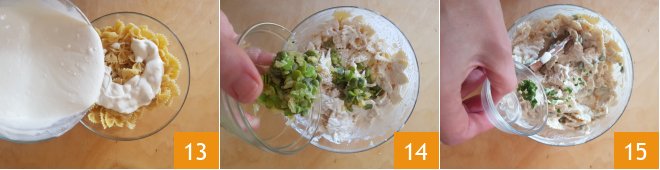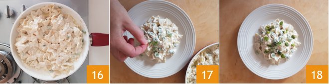 As soon as the bow-tie pasta is cooked, drain it and transfer it to a bowl. Add the ricotta cream 13 and mix. Then add the fava beans, keeping some aside for garnishing the dish, and stir again. Also add a few marjoram leaves 15 and mix.