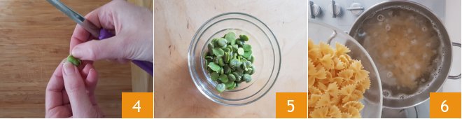 Using a small knife, peel the fava beans 4 and collect them in another small bowl 5. At this point, add the pasta 6 and cook it a couple of minutes less than the time indicated on the package.