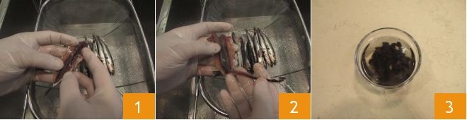 To prepare the pasta with sardines start by cleaning them if not already cleaned. Cleaning them is very simple, just detach the head and pull them open 1 by sliding your finger between the two parts, so you can gently detach the central bone 2. During this operation use a trickle of running water to eliminate the waste and clean the sardines at the same time. Keep the clean sardines on a plate. Soak the raisins for about ten minutes 3.