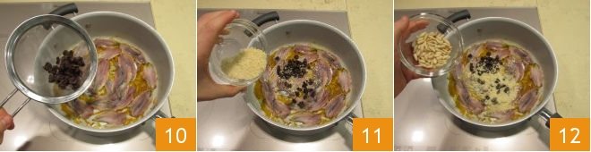 Then drain and rinse the raisins and pour them into the pan 10, add the finely ground almonds 11 and whole pine nuts 12, stir and continue cooking over a low flame for another 10 minutes.