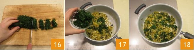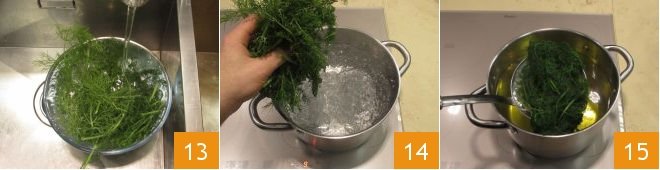 Put a pot on the stove with plenty of water to boil and then add the fennel. If you buy the fennel uncleaned, you can buy 0.4 lb (180 g) of it so that once cleaned, having removed the leathery parts, you will have 0.27 lb (125 g) left to use for the recipe. Then rinse the tender part 13 and blanch for a couple of minutes 14. Drain well, without throwing away the water, letting the fennel cool for a few moments so you can handle it 15.