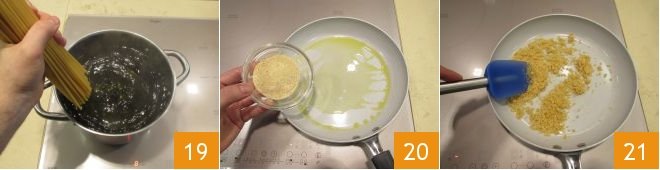 Boil the pasta in the same water that you cooked the fennel in 19. In the meantime, toast the breadcrumbs and pour into a pan with 2.2 tsp (10 g) of oil 20. Mix often to keep from burning and when they are golden brown, turn off the heat 21.