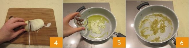 Slice an onion as finely as possible (you can chop it in a mixer for a few moments on pulse to avoid obtaining a mush) 4 and pour it into a pan with the olive oil and anchovies 5. Cook for about ten minutes over low heat and stir frequently, so that the base lightly fries without burning and the anchovies dissolve 6.