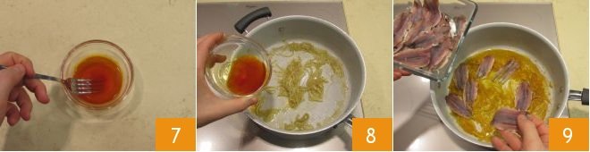 In the meantime, dilute the saffron in the water stirring with a fork 7 and then pour it into the pan 8 and add the clean sardines 9.