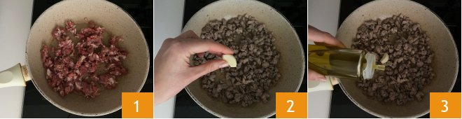 To make pasta with sausage and stracchino, first place a pot full of water on the stove and salt it when it boils, as it will be needed for cooking the pasta. Place the crumbled sausage without the casing in a pan 1, sauté it for 2-3 minutes, then add the peeled garlic 2 and olive oil 3.