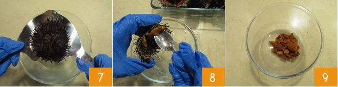 Move on to the sea urchins: use the appropriate tool to divide them in half 7 and using a teaspoon extract only the red part (8-9).