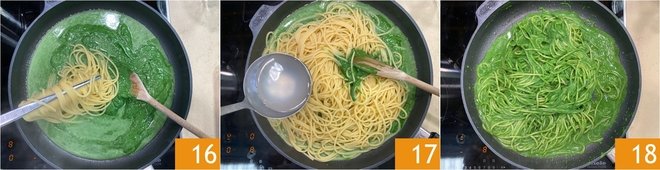 Drain the pasta al dente and transfer it directly to the sauce 16. If necessary, add another ladle of water 17 and toss everything well 18.