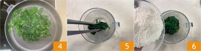 Continue cooking for a few more minutes without the lid to allow the liquid to evaporate well 4, then let it cool slightly. Then transfer the spinach to a blender 5 and add the grated Parmigiano Reggiano 6.