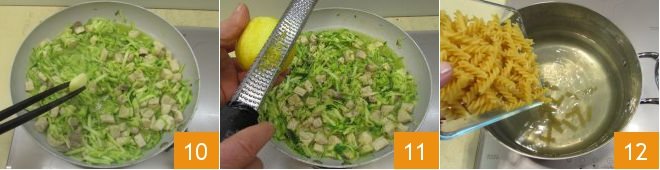 remove the garlic clove with kitchen tongs 10 and scent with grated lemon zest. Boil the fusilli in the pot with salted water brought to a boil for about 11 minutes or as indicated on the package 12; they should be al dente.