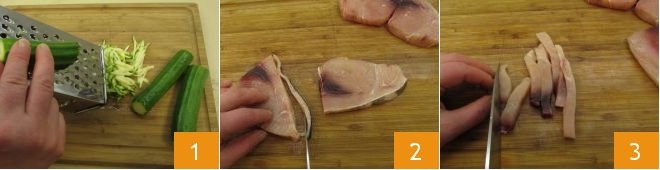 To make the pasta with swordfish and zucchini, bring plenty of water to a boil in a pot and when it boils, salt it; meanwhile wash and trim the zucchinis, then julienne them with a coarse grater 1, then clean the swordfish slices: remove the strip of lateral skin 2 and cut the flesh first into strips 3