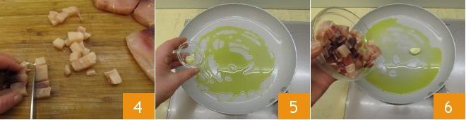 then into small cubes of about 1/2 inch 4. In a pan, heat the extra virgin olive oil with the whole garlic clove 5, then add the swordfish pieces 6